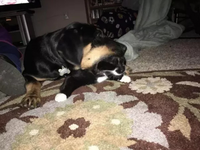 Before anyone asks, the cat didn’t try to get away; he loves the attention and the dog. He was only mouthing him and basically getting him covered in dog slobber. The cat is strange.