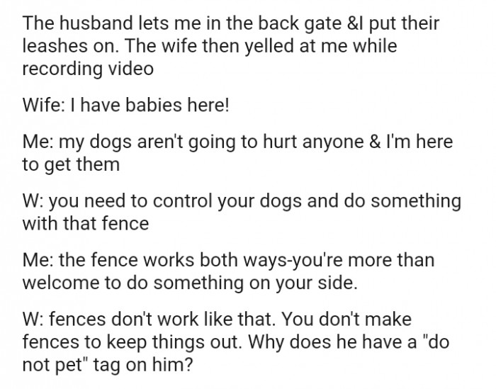 A study by Dr. Helen Fisher, a biological anthropologist, suggests that aggressive responses often stem from perceived threats to one's social identity or loved ones. She states, "When individuals feel their social bonds are threatened, they may react defensively to protect those connections." In this case, the woman's reaction can be interpreted as an instinctual effort to safeguard her dogs, whom she considers integral to her social identity. Recognizing this dynamic can enhance communication among neighbors and help mitigate future conflicts.