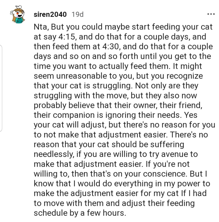 When they moved halfway across the country for a job, the cat found it difficult to adjust, as it was a new time zone. OP also stated that the cat had been waking them up by 4 AM for breakfast.