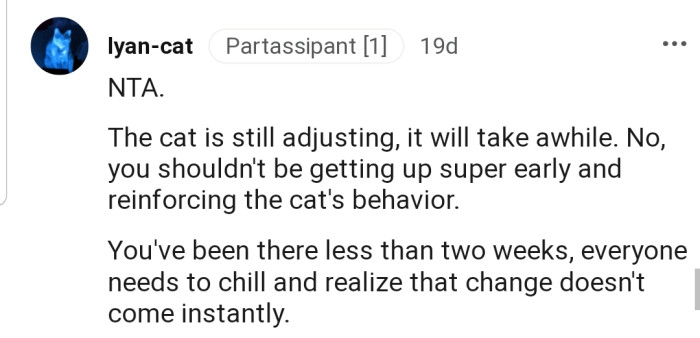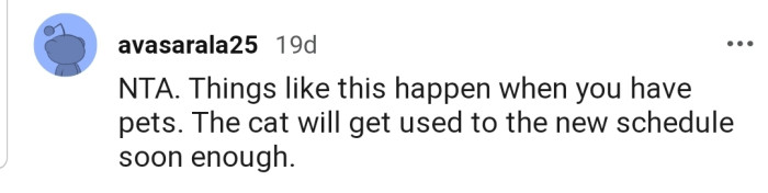 "The cat will get used to the new schedule soon enough."