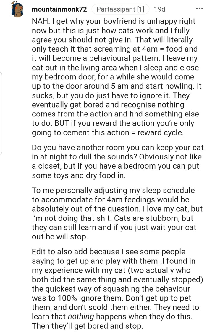 "I get why your boyfriend is unhappy right now, but this is just how cats work, and I fully agree you should not give in."