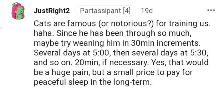 "No, you shouldn't be getting up super early and reinforcing the cat's behavior."