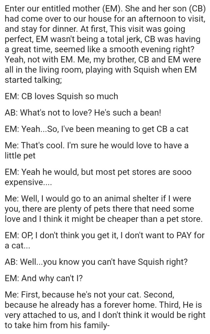 This entitled mom started talking about how her son would love a little pet and that she didn't want to pay to get her. This means that she expects Squish to be given to her for free, and that wasn't happening.