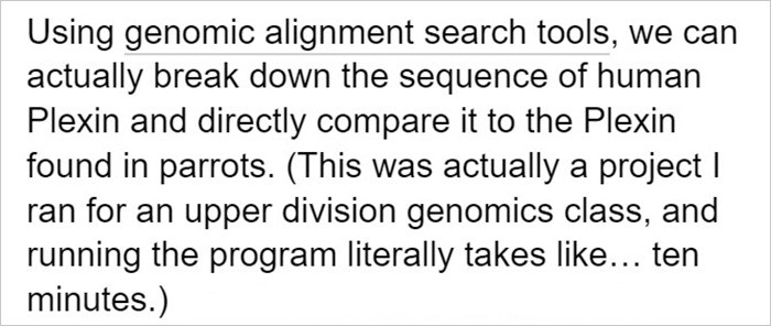 "Using genomic alignment search tools, we can actually break down the sequence of human Plexin and directly compare it to the Plexin found in parrots."