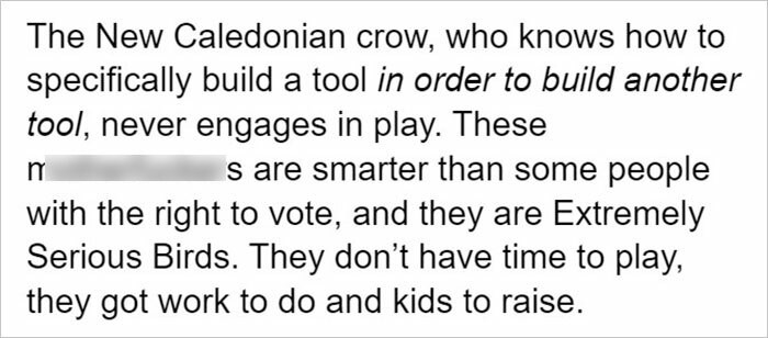 The account highlighted how incredibly intelligent these creatures truly are. Corvids, on the other hand, seem to take their intellect more seriously, while it could be said that parrots excel in social gatherings for such purposes.