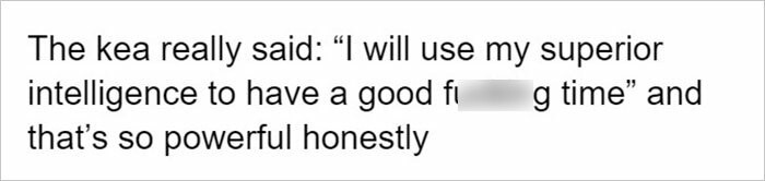 “The kea really said: ‘I will use my superior intelligence to have a good [effin’] time’, and that’s honestly so powerful.”