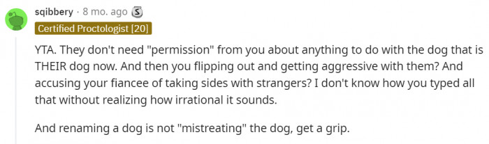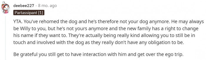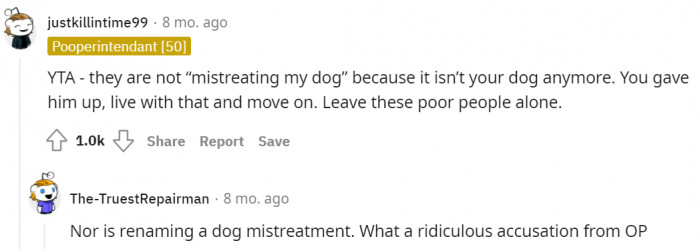 But his reaction to the new family renaming the dog could put him in hot water. It's one thing to be sad about losing a pet, but it's another thing entirely to lash out and try to cause problems for the people who took him in.