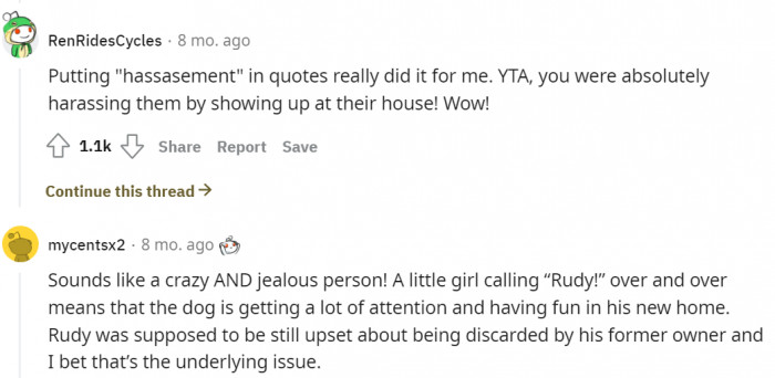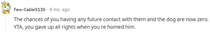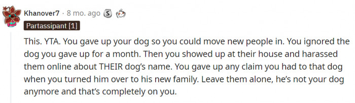 "You gave up any claim you had to that dog when you turned him over to his new family. Leave them alone, he’s not your dog anymore"