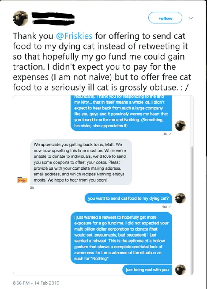 Rather than simply granting his request for a retweet of his GoFundMe post, Friskies chose to send him free cat food. The cat owner called the brand grossly obtuse because they were sending food to a dying cat.