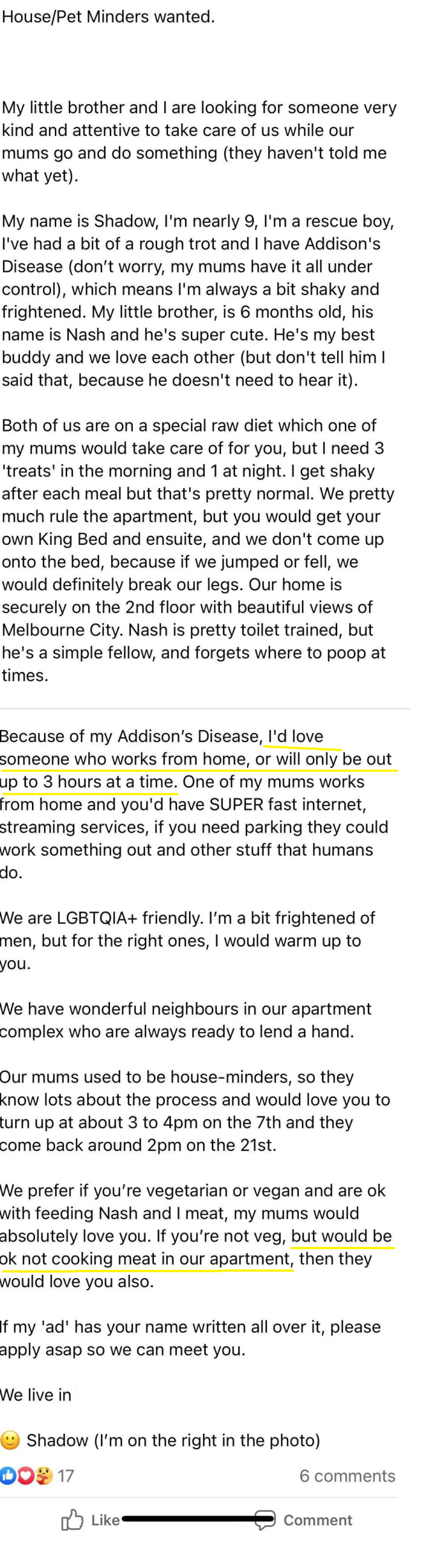 The ad, which was posted on Facebook, details that the potential pet sitter would be taking care of a dog with Addison's disease and a puppy. The dogs will be fed a special raw diet.