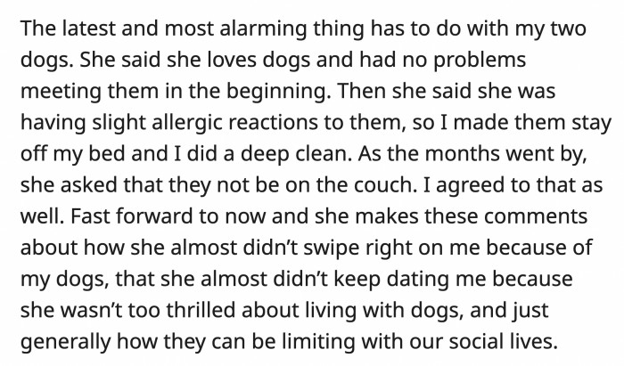 She told OP how she almost didn't swipe right on their dating profile because of their dogs. She also said she was hesitant at first to pursue a relationship with OP because she wasn't thrilled about living with dogs, and she thought they would limit their social lives.