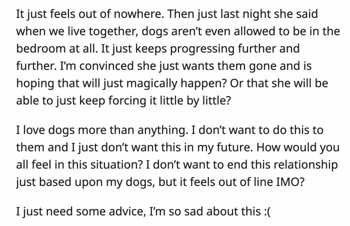 OP is worried that she will ask him to get rid of his dogs or that she will slowly escalate her demands until OP gets rid of their dogs themselves to accommodate her. OP says they love dogs more than anything, and they wouldn't give in to their girlfriend's demands.