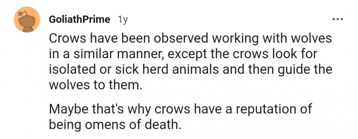 "Crows have been observed working with wolves in a similar manner"