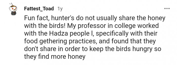 In an article OP shared with their post, Claire Spottiswoode, a zoologist from the University of Cambridge, revealed that the bird leads local hunters to wild beehives located in trees.