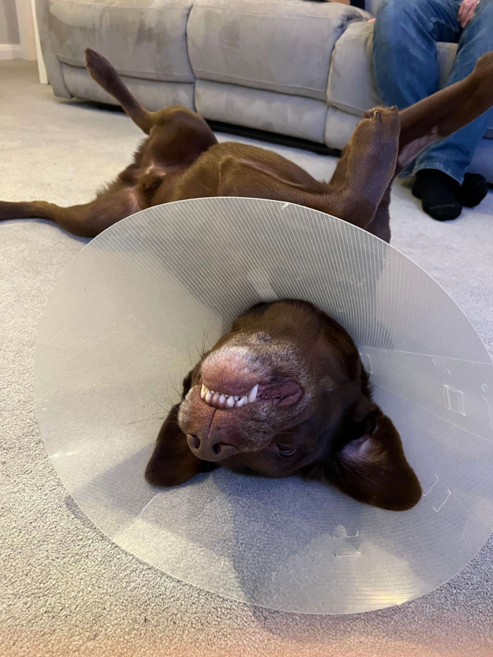 Ollie recently underwent minor surgery that required a few stitches. In the end, he was fitted with an Elizabeth collar for protection, so his wound could heal properly without him interfering with it.