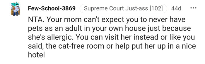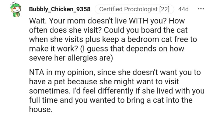 According to them, OP is allowed to have a cat, but they should also accept that keeping the cat may prevent their mother from visiting due to her allergy.