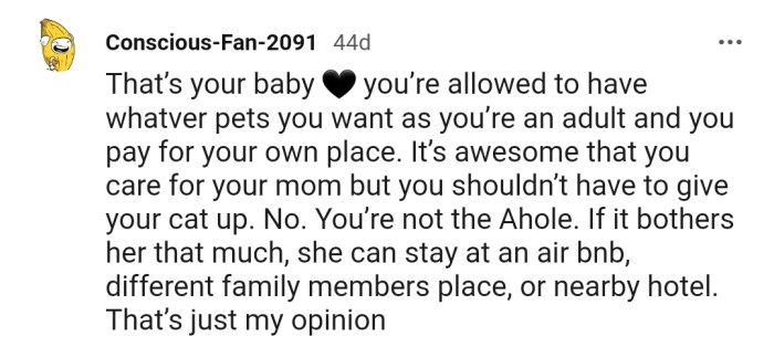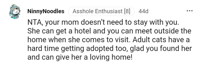 Although OP assured her that they would keep two bedrooms cat-free so she could visit, this assurance did nothing to ease OP’s mother’s anger. This left OP in an awkward position, as they love the cat and cannot leave her since no shelters around them accept adult cats.