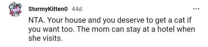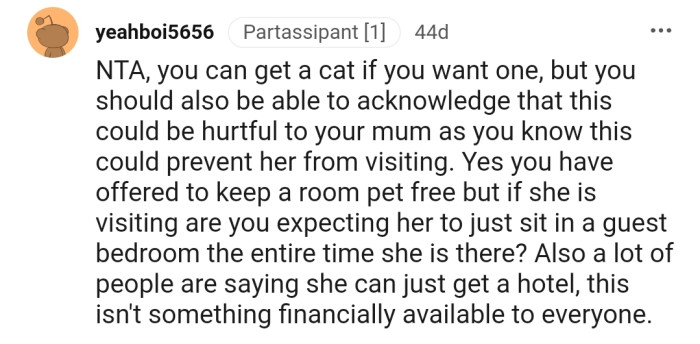 "You can get a cat if you want one, but you should also be able to acknowledge that this could be hurtful to your mum."