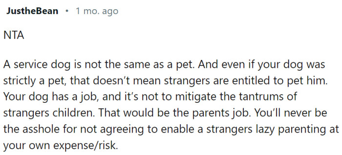 "Your dog has a job, and it’s not to mitigate the tantrums of strangers' children"