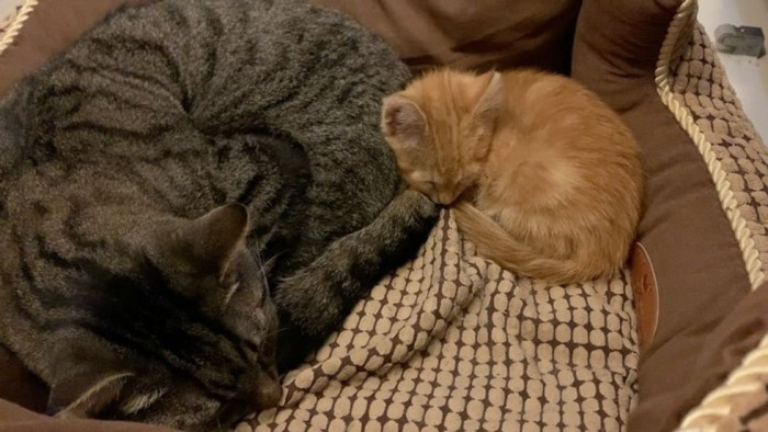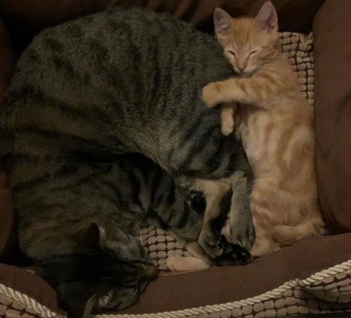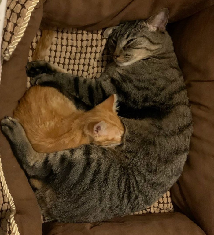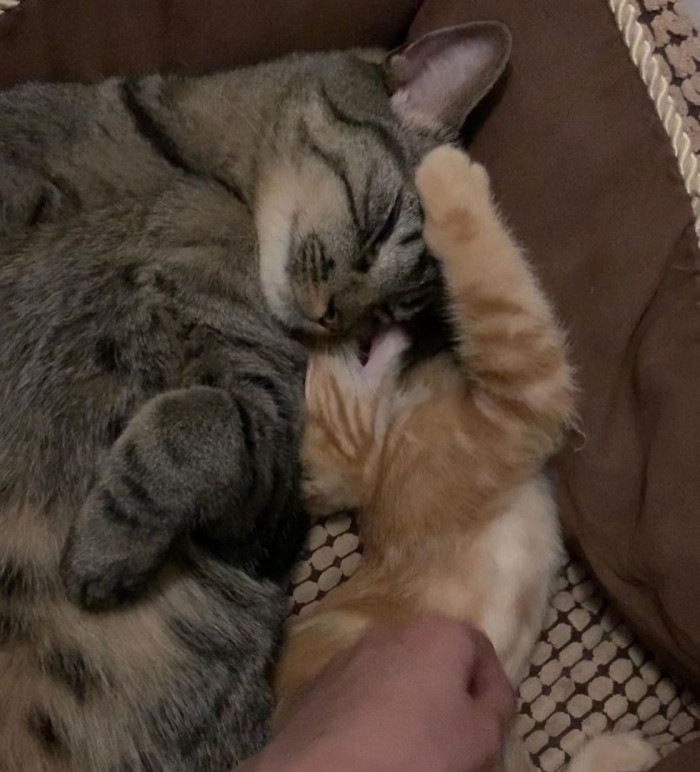 "He found comfort in Z's chubby belly and just started purring," Ally said. Z showered Finn with care and love, boosting Finn's confidence.