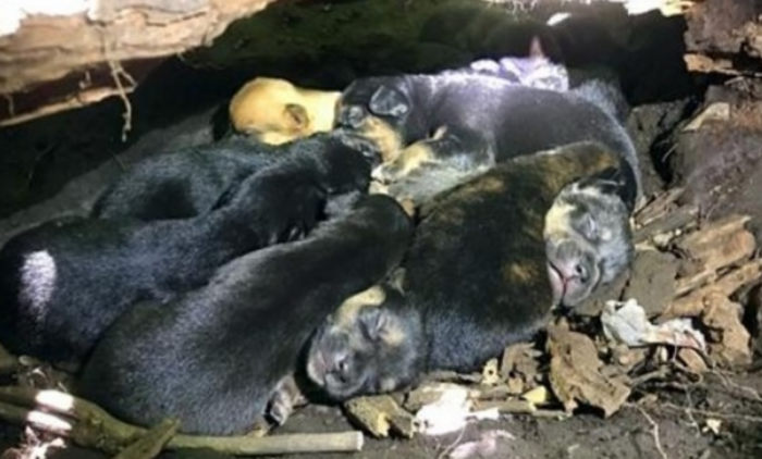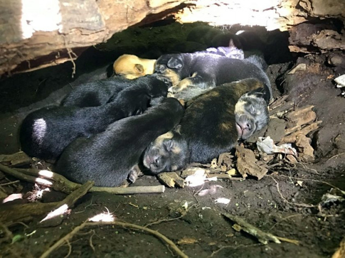 Despite her injury, the mama dog dug a hole deep enough in the ground to create a safe haven for her pups, where they were all safe and warm. The best part is that there weren't just a few pups, but thirteen!