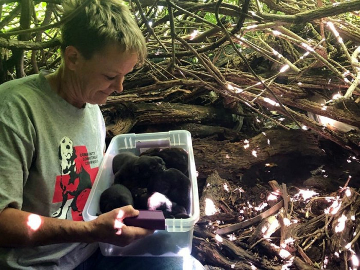 The rescuers then placed all the pups one by one in a plastic container and brought them back to their mom so they could all be taken to the clinic at the same time. There, they received all the medical care that they needed.