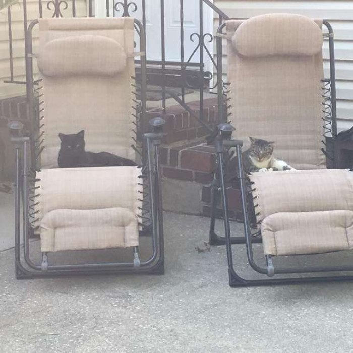 "They won't come inside or let us touch them — but they recognize us, nap on the stoop or in the lawn chairs, coexist with us in the backyard, and sometimes come up to the window when it's time to eat."