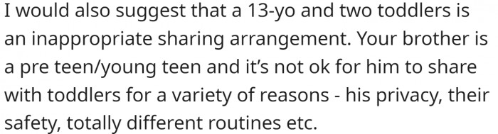 "13-yo and two toddlers is an inappropriate sharing arrangement"