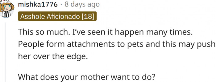 In this case, the daughter may need to provide additional emotional support to her mother, acknowledging the depth of her grief while also helping her navigate the practical aspects of pet care.