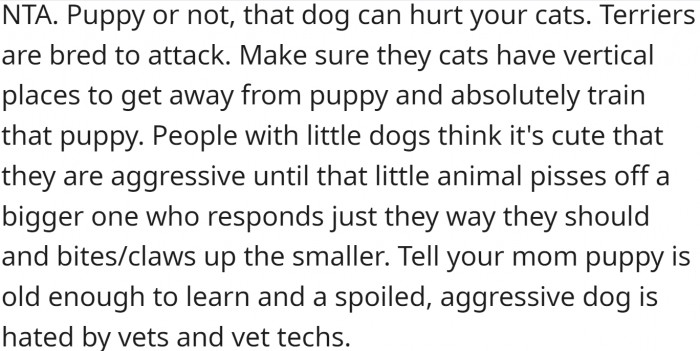 OP tries to punish the puppy whenever it goes after the cats, but their mom is against it and criticizes them. OP constantly tells their mom that the dog needs to be trained, but she doesn't care.