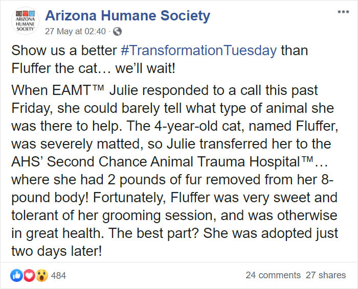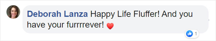 But that's not the end of the story. Merely two days later, Fluffer was adopted by her new, cat-loving owners!