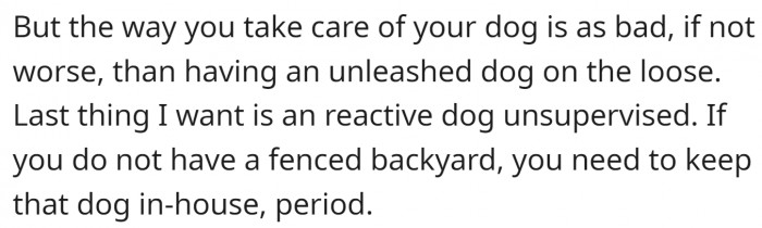 "If you do not have a fenced backyard, you need to keep that dog in-house, period."