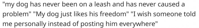 "My dog has never been on a leash and has never caused a problem" and "My dog just likes his freedom."