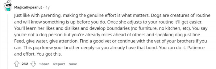This man inherited a dog from his younger brother, but he is strictly a cat person. He has almost no interest in the animal, but of course, he wants to take care of it because it was his brother's dog.