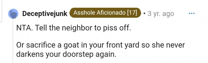 "Sacrifice a goat in your front yard so she never darkens your doorstep again."