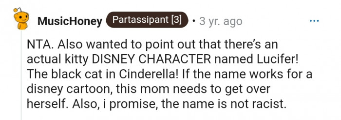 "Wanted to point out that there’s an actual kitty DISNEY CHARACTER named Lucifer! The black cat in Cinderella!"