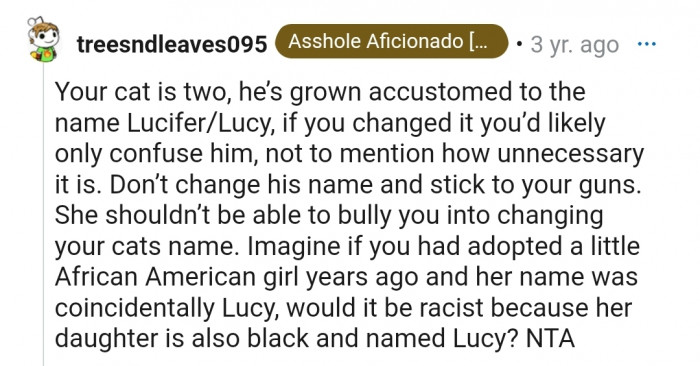 "Don’t change his name and stick to your guns. She shouldn’t be able to bully you into changing your cat's name"