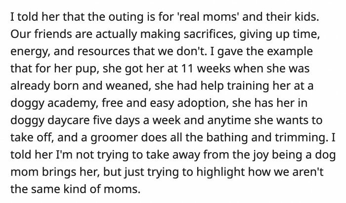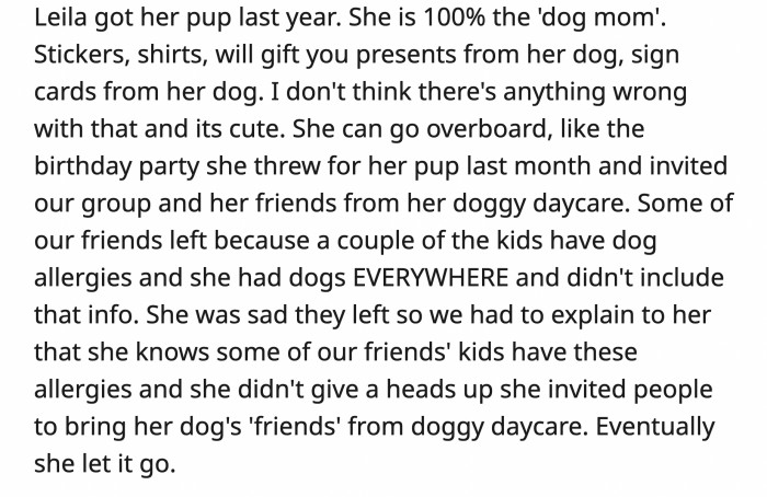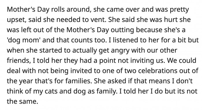 She said she was upset that she was left out of the Mother's Day outing just because she's a dog mom. OP listened to her, but she stopped Leila once she started getting actually mad at their other friends.