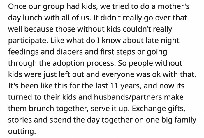 The group decided together that those with kids should probably celebrate the day with their kids and families. It has been this way for 11 years now, and they all basically have an outing on the day together where the dads and kids cook brunch for the moms, exchange gifts, and trade stories.