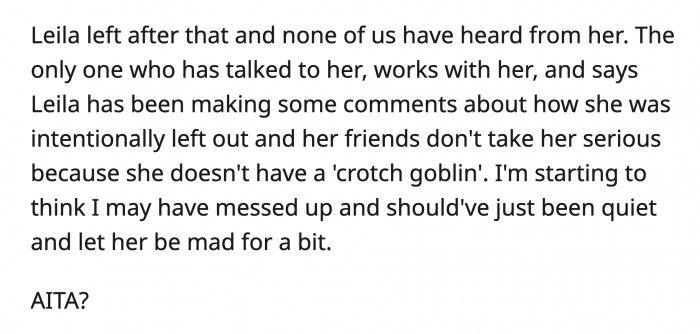 Leila left, and no one has heard from her except for one friend who happens to work with her. Apparently, Leila has been saying that she has been intentionally left out of the group and the celebration because she doesn't have a "crotch goblin."