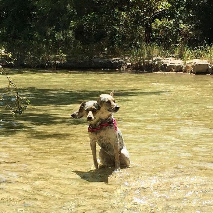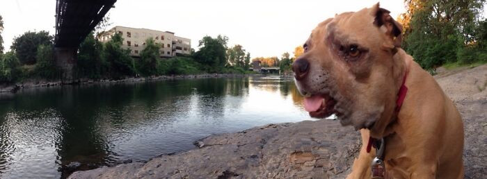 "Tried To Take A Panoramic Picture With My Dog In It. Instead I Got Sloth From The Goonies Enjoying A Day At The River"