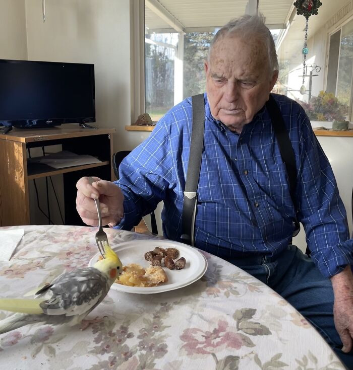 "My Grandpa And His Bird Eating Breakfast With Their Matching Hairstyles"
