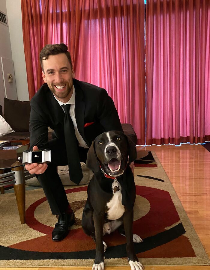 "My Dog Leonard And I Dressed In Matching Outfits To Propose To My Fiancé (His Idea). If You Look Closely, You Can See His Black Tie. We’re Both Elated She Said Yes"