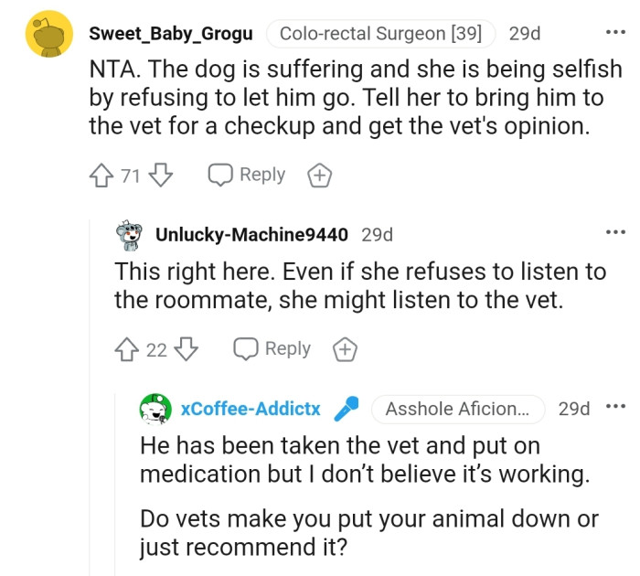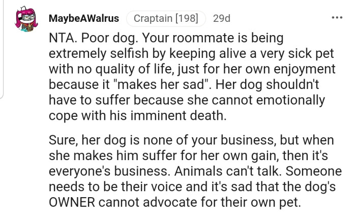 Many acknowledge the difficulty of the conversation but emphasize the importance of advocating for the dog's best interests. Some even label their roommate's actions as selfish, asserting that euthanasia would be a compassionate choice.