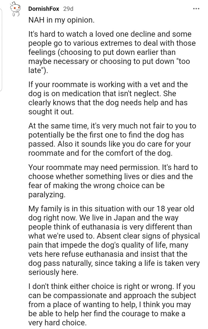 Ultimately, the decision surrounding a pet's end-of-life care is deeply personal and emotionally charged. By engaging in compassionate dialogue and seeking professional guidance, both the Redditor and their roommate can navigate this difficult situation while honoring their shared love for the pet.
