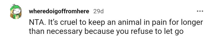 This scenario illustrates the emotional complexity of making end-of-life decisions for pets, often exacerbated by strong attachments and differing perspectives. It’s essential for individuals to approach such discussions with empathy and care, recognizing the emotional weight behind these choices. Encouraging open communication about feelings and seeking professional advice can facilitate a more supportive environment during this challenging time.