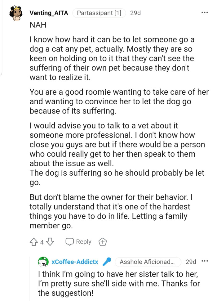 "You are a good roomie wanting to take care of her and wanting to convince her to let the dog go because of its suffering."