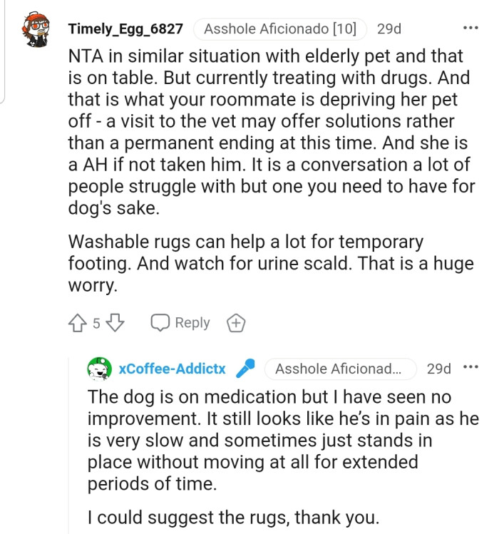 Furthermore, providing emotional support to the roommate during this process is vital. According to studies in the field of grief counseling, having a support system can significantly alleviate feelings of isolation and despair. The Redditor could offer to accompany their roommate to the veterinarian or engage in discussions about the pet's health, demonstrating compassion and understanding.