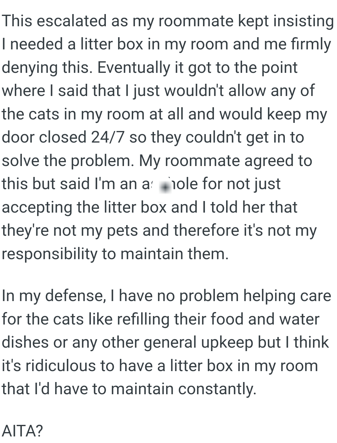She added that the cats would need a place to use the bathroom if they got stuck in OP's room with the door closed. OP told her roommate that she wasn't going to put a litter box in her room.