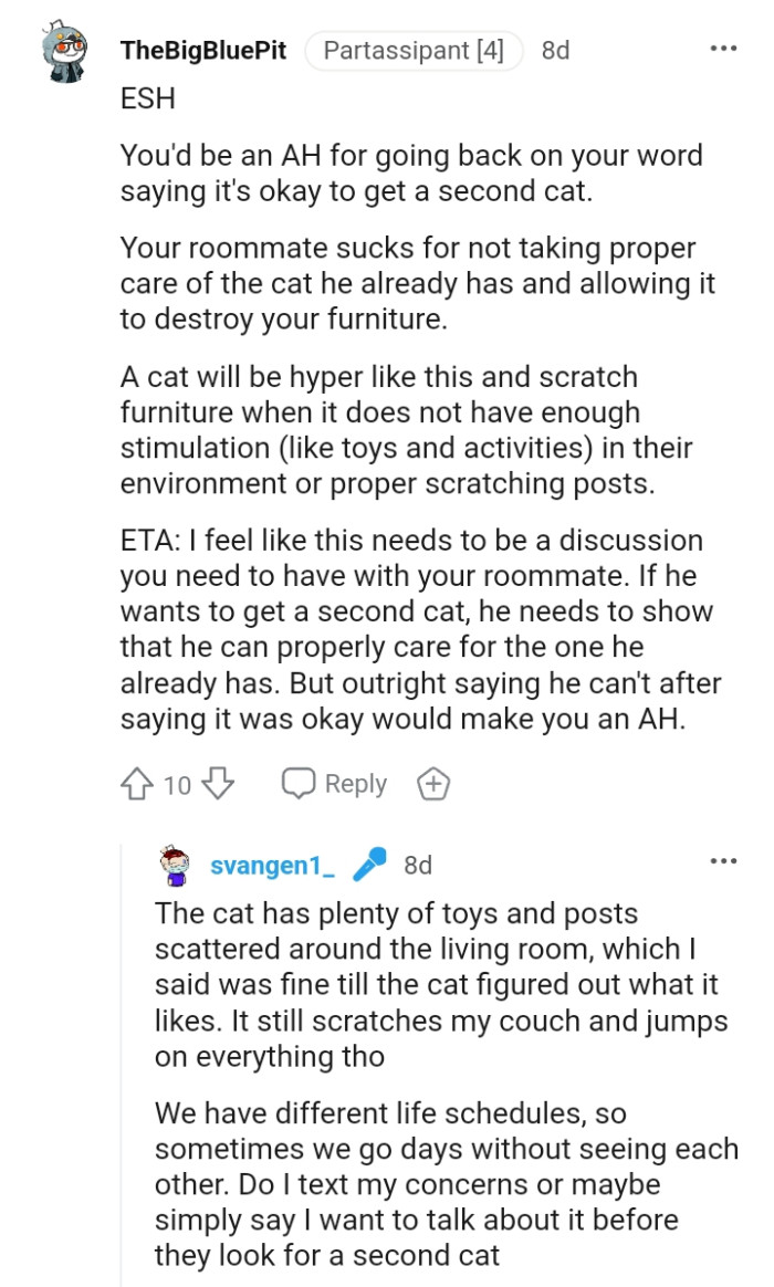 The roommate's cat wasn't so bad, but it died, and his roommate got another cat. It didn't stop there, as the roommate wants to get a second cat so it won't be lonely on days when they have to work late.
